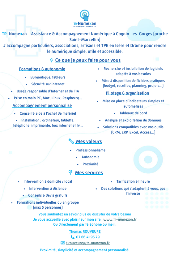 Basé à Cognin-les-Gorges, proche de Saint Marcellin, j’aide particuliers, associations, communauté, artisans et TPE en Isère et Drôme à rendre le numérique simple, utile et accessible.