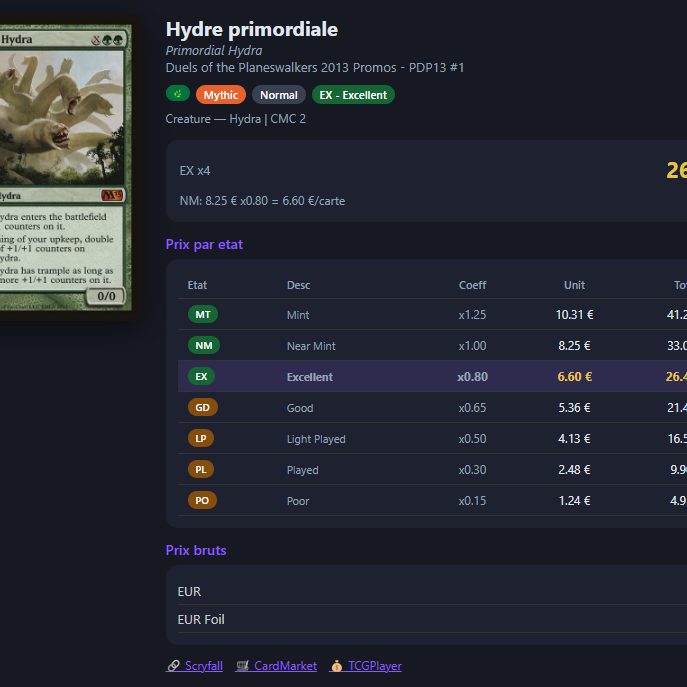 Les valeurs sont calculées à partir des principales sources reconnues du marché (Scryfall, TCG Player, CardMarket), garantissant une estimation précise et à jour.