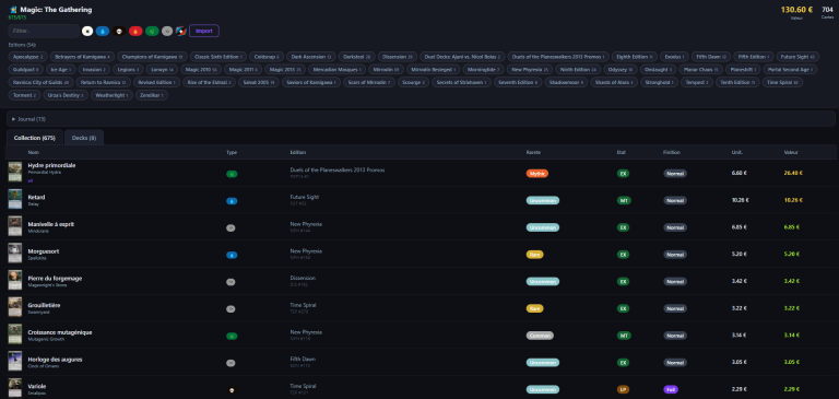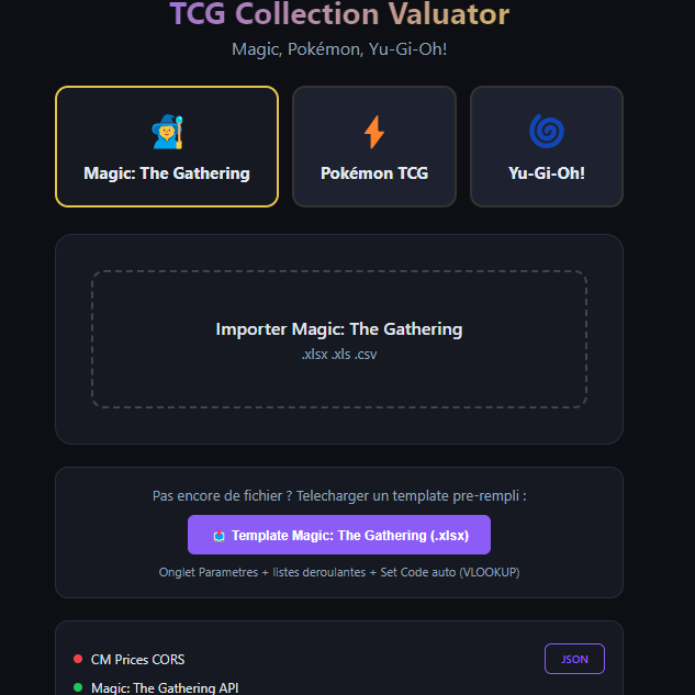 Avec TCG – Collection Valuator, fini de passer des heures à estimer vos cartes une par une en recherchant leur cote sur différents sites. Il vous suffit de saisir votre collection dans un fichier Excel, puis de l’importer dans TCG – Collection Valuator. L’outil valorisera automatiquement votre collection à partir de votre fichier Excel et des valeurs issues des principaux sites de référence : Scryfall, TCG Player et CardMarket.